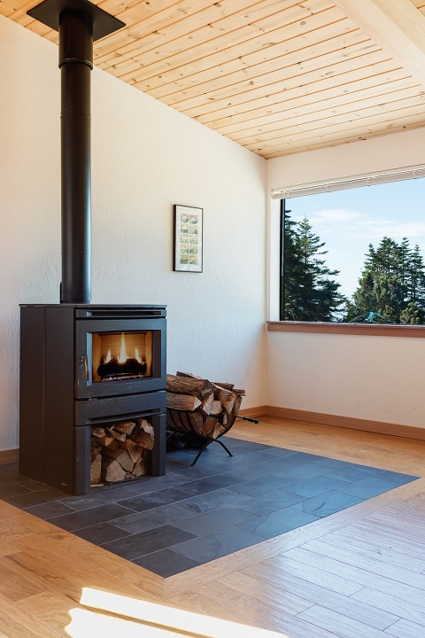 Downstairs on the kitchen level, previously dominated by rough-hewn ceiling timbers that gave the room a decidedly “Ratskeller” look, we installed a sophisticated new kitchen with cherry and gloss-white cabinets from Ikea, organic white Caesarstone countertops, a cherry butcher-block bar counter and new stainless steel appliances and backsplash. The view to the ocean has been opened with a generous new picture window and all the existing trim has been replaced with clear-finished vertical-grain Douglas Fir. These improvements, along with several coats of bright white paint on the walls and ceiling timbers, have truly made this kitchen/dining room the place to be.