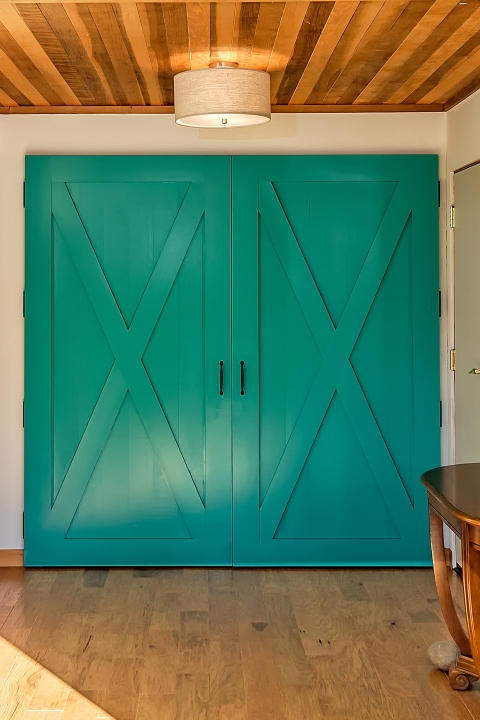 The entry, at mid-level between kitchen and living room, has new 5-inch wide hickory plank floors, new lighting and a spectacular turquoise-painted barn door that conceals the existing, awkwardly located closets. The hickory floors are now carried throughout the home, eliminating dust-infected carpet, concrete tile and oak floors that had accumulated over earlier haphazard remodels.