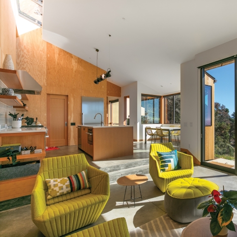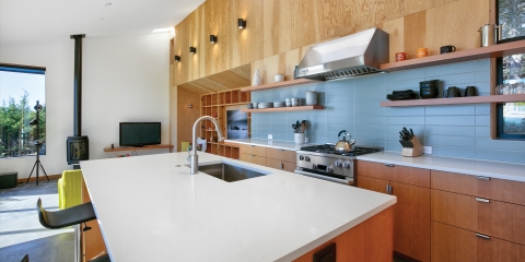 The clients, a young couple from the Bay Area, had a very good idea of what they wanted, and it was fun to work with this palette of simple and rustic finishes to produce their vision. The exterior of the home is clad in corrugated Corten steel and Cedar siding, with clean stainless steel cable railings around the view deck. The interior is very simple: concrete floors, plywood walls and doors, with sheetrock used to contrast with the wood finishes. Vertical Grain Fir cabinets are nicely offset with white quartz countertops and stainless steel appliances. The bathrooms are finished with large format tiles, installed in an exactingly straightforward pattern.