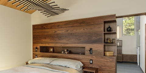 Jeni Gamble and Murray Agnew, of Gamble + Design, handled interior design and lighting. Their exacting design elements can be seen throughout the home, and presented a number of welcome challenges for us throughout construction. Some of our favorite interior features of the home are the walnut and tile floors, walnut cabinetry by Jackson Hantzche and Henrybuilt (including a stunning master bed unit, and an innovative master vanity and mirror assembly), Heath Tile by Nathan Hake at the fireplace and kitchen wall, and eye catching lighting fixtures at every turn.