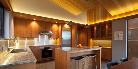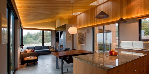Vertical Grain Douglas Fir Built-ins, by Jackson Hantzche of Premier Glass & Cabinet, provide many of the furniture needs inside the home, helping to bring the clean lines of the exterior inside. Tinted Concrete Floors, with hydronic heat, are juxtaposed with sheetrock walls, and wood paneled ceilings. Granite countertops, walk-in tiled showers, indirect LED soffit lighting, and a steel-clad fireplace complete this home. Design assistance by Gayle Forster, working with architect and client, creative interior design direction, emphasizing paint finish, furniture and furnishings.