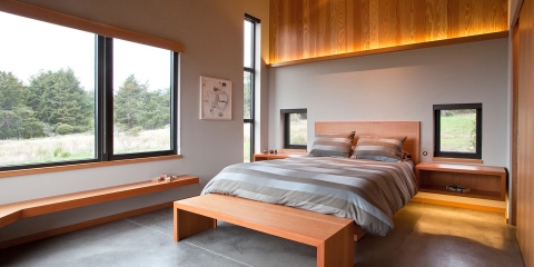 Architect Alex Bergtraun—of Studiobergtraun AIA—has taken a fresh approach to traditional Sea Ranch Architecture, mixing time tested materials such as Cedar Siding with an exciting new one: Cor-Ten Steel. The corrugated metal roof is appointed with both Photovoltaic and Solar Hot Water Panels, which provide much of the energy needed to operate the home. Inset Gerkin Windows break up the exterior facade, and provide repeating visual points of interest.